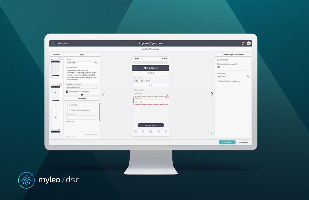Bei der App-Erstellung im Editor der myleo / dsc können Kunden eine individuelle Anzahl an benötigten Screens zu ihrer App hinzufügen. Auf jedem dieser Einzelbildschirme ist es möglich, angezeigte Texte zu definieren, per Drag & Drop Eingabefelder zu platzieren und auf diese Weise relevante Informationen zu erfassen. Dabei steht eine große Auswahl aus verschiedensten Feldern beispielsweise zur Validierung von Telefonnummern, Checkboxen, Dropdown-Menüs oder einer Scan-Funktion zur Verfügung.